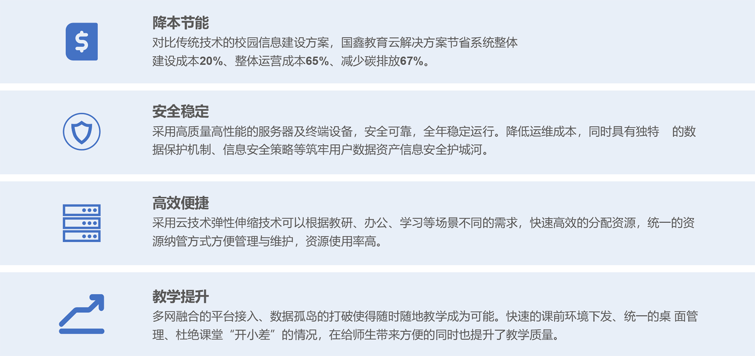 微拍堂官网教育云解决方案是针对教育业现状及遵循政策指导方向,采用自研国产硬件及自研软件平台,推出的教育行业云平台方案。方案基于云计算技术、互联网+战略格局、契合融合创新的思路,助力校园智慧建设,更好地为教育改革和开展给予信息化基础环境支撑。